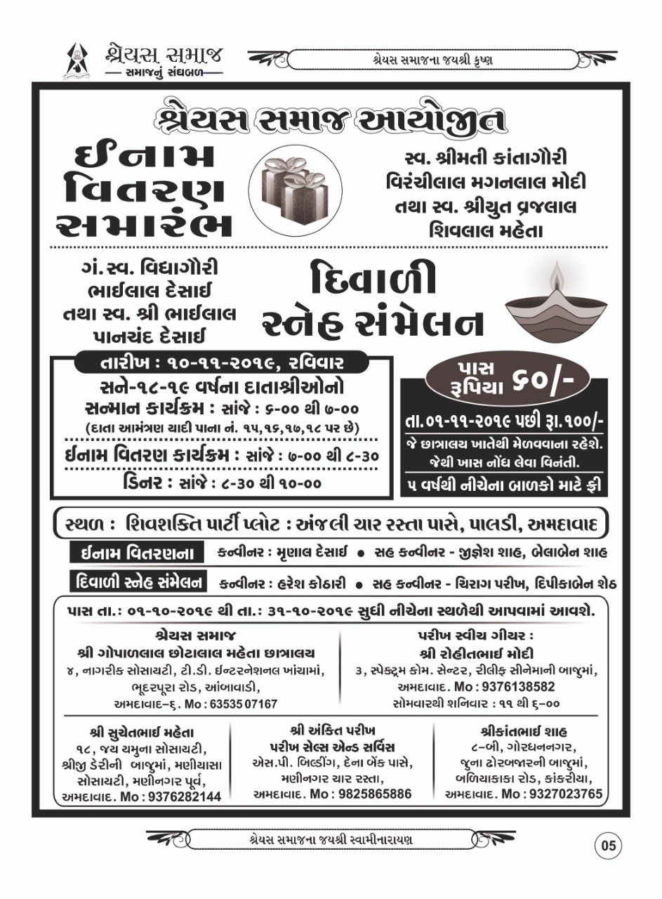 Event Name : Shreyas Samaj Diwali Sneh Sammelan and Inam Vitran Program